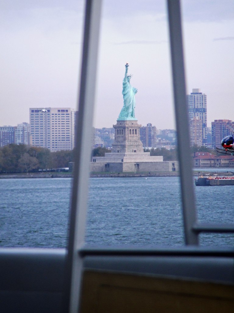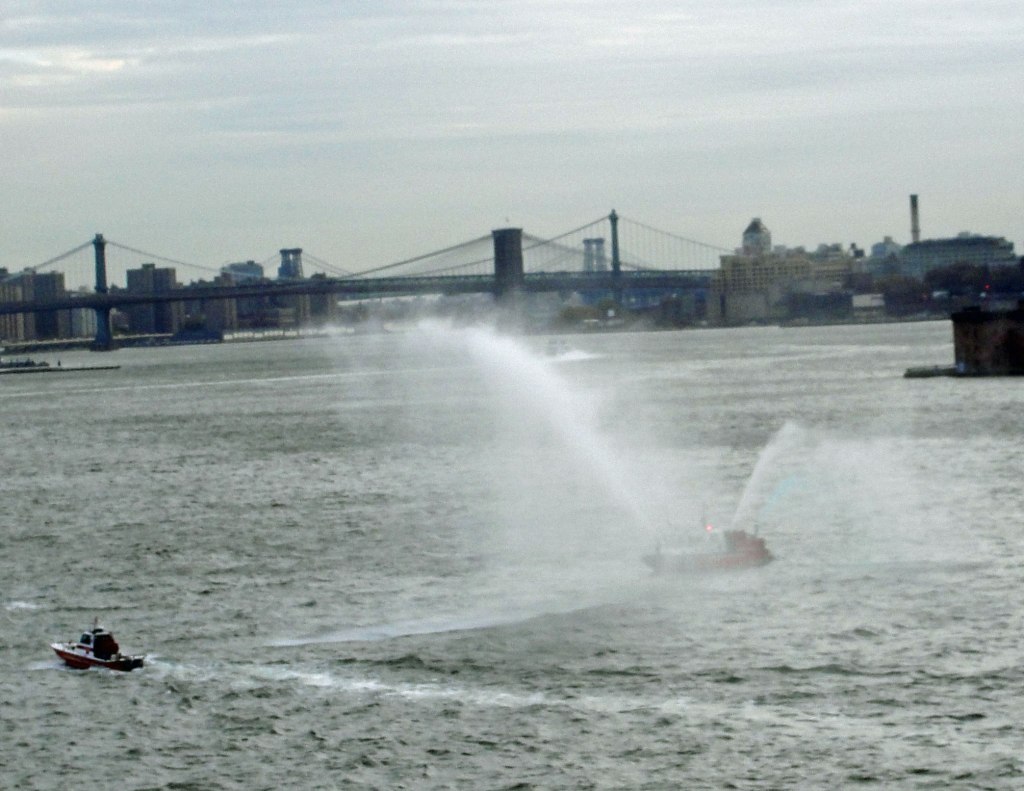Along the shore I could already see the twinkling lights of police cars positioned about two blocks apart. Just before we passed under the Verrazano Bridge, we were joined by police boats, which looked tiny, compared to our 684-foot-long vessel. Smaller still were the Coast Guard RHIBs—inflatable rubber boats with mounted weapons. Off our starboard side a diminutive barge displayed a huge American Flag hung like a curtain through which the rising sun was beginning to shine. Above us flew a host of police and media helicopters, and around us sailed a collection of bright red tugs. But the most impressive of all were the fireboats shooting streams of red, white and blue water 200 feet into the air. We sailed past the Statue of Liberty and there before us sat lower Manhattan, glowing in the reflected early morning light.