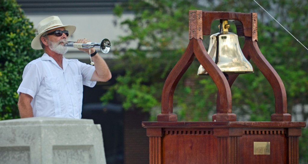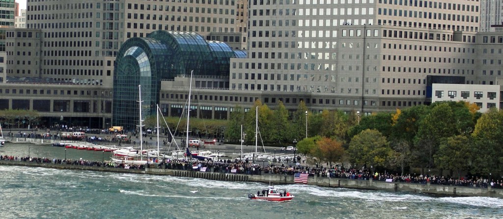 It was almost time. As we approached Ground Zero, instinctively conversations came to a close. Then a whistle sounded. As one, we raised our hands in salute.  Our ship, USS NEW YORK, with its bow stem made from World Trade Center steel, slowed and then stopped in the water.