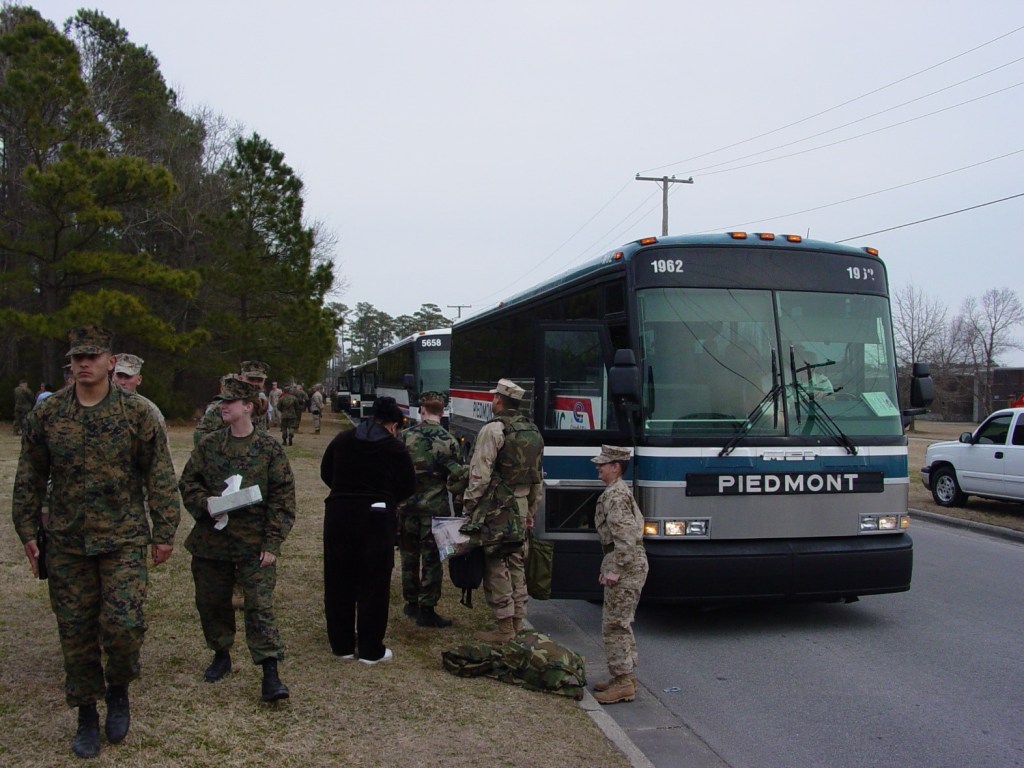 The stop at the armory lasted several hours. Then a bus broke down. At 1215, with bag lunches on our laps, we finally exited Camp Lejeune for the drive along Freedom Way. Familiar, now unreachable, sights passed like a dream: The K-Mart that never carried what I needed, the place I bought my blue couch, China Garden with their great fish soup, the Swansboro Historic District, home to the Elvis-themed café, and Flying Bridge Restaurant where just last night Ken and I ate lots of oysters. We arrived at Cherry Point for our flight in less than an hour and lined up to pass seabags and ALICE packs from the buses to the loading area. We sat for two hours on the hangar floor, waiting for scales to arrive. I weighed in at 152 lbs. without gear and 244 lbs. wearing it.